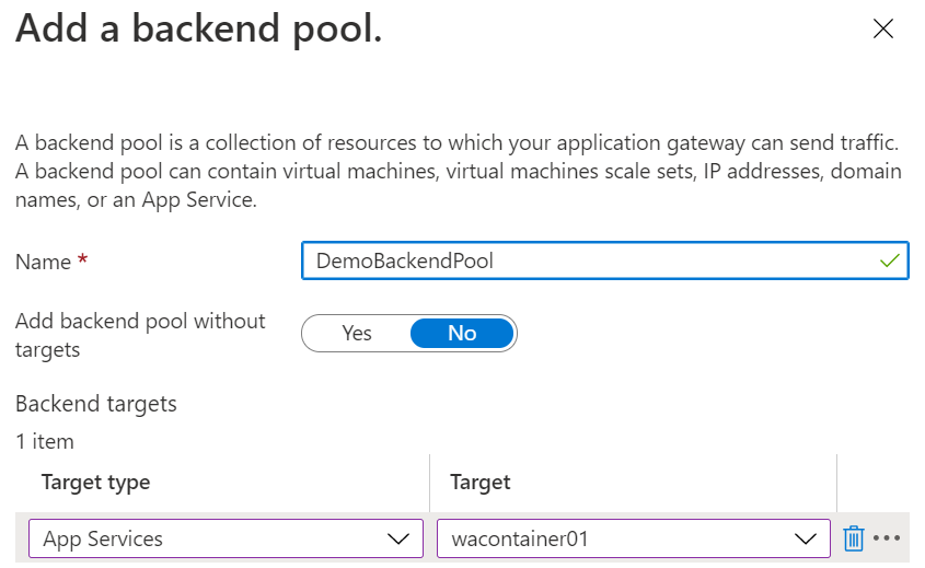 2. In the Add a backend pool window that opens, enter the following values to create an empty backend pool: